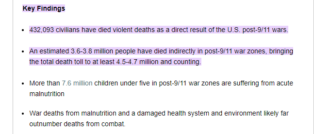 Without in any way endorsing these figures, but only as an indication of scale, I note that the Watson Institute of International & Public Affairs (Brown University) has found that over 432 thousand civilians have died violent deaths as a direct result of the US post 9/11 wars (with with more indirect deaths in the millions).