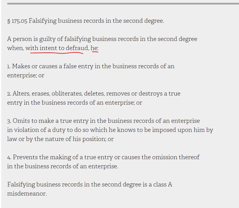 Such an error in business records is a misdemeanor in New York. But before political inquisitor Alvin Bragg can bootstrap this into 34 felonies, there are wide & tall walls to breach. The misdemeanor is passed the statute of limitations (2 years). Then even the second degree class A misdemeanor requires an intent to defraud.