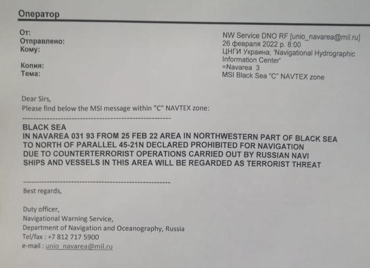 It is true that Russia early on urged all international vessels to leave the war zone, and provided help for them to do so. Note this formal letter distributed by the IMO at Russia's request, and addressed to all IMO members. It established a 3 miles wide (139 miles long) "blue safe maritime corridor" to allow for evacuation of neutral ships (as per common sense and the laws and customs of naval warfare).
