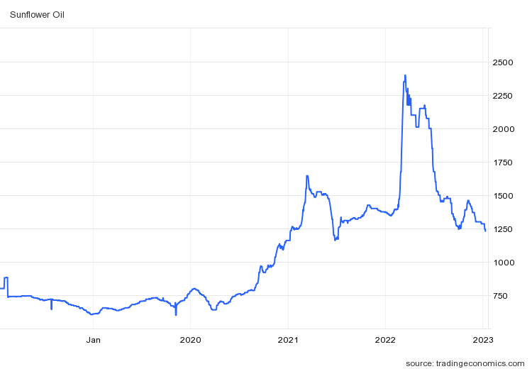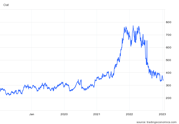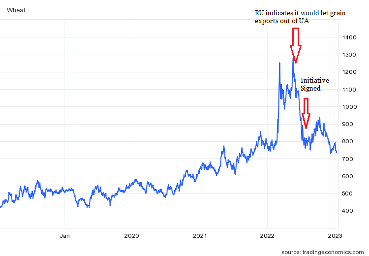 The Grain Initiative was signed on July 22, immediately after the peak prices (subsequently prices rose again before coming down as substantial shiploads from Ukraine started to have an effect). Charts for oats, sunflower and rapeseed oil, and to a lesser extent corn and soybeans look very similar.