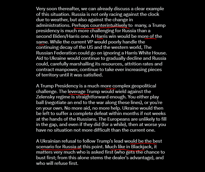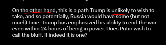 VP Harris would be easy to predict and defeat. Trump, different ballgame. Since Trump's leverage on Russia is is limited, if not exhausted, Trump would be wise to first "ask" Ukraine first. If Zelensky is unwilling to end the war along current ceasefire lines, then there is no reason to get into a shoving match with Russia.