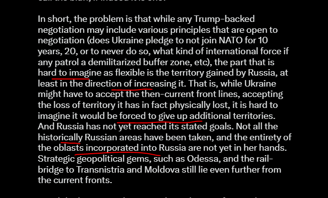 Regardless of this turn (& we will get to where it is now, and the "rare earths" deal), the situation is still dynamic, and could even change again. The underlying fundamental issue remains, as stated in that same, impressively accurate post. We have heard comments from the likes of Peskov, Lavrov and Nebenzia stating quite clearly and resolutely that the regions (oblasts) that are now Russia per the constitution are not subject to negotiation.