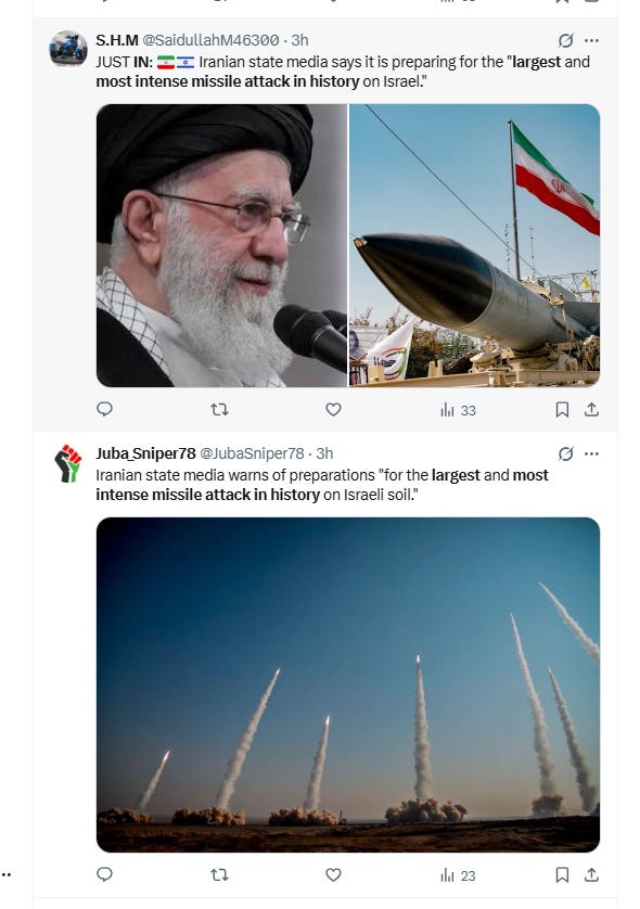 preparing for the "largest and most intense missile attack in history" (on Israeli soil), which I believe is Persian for "we are almost out of launchers & are getting beaten, please by afraid and stop".