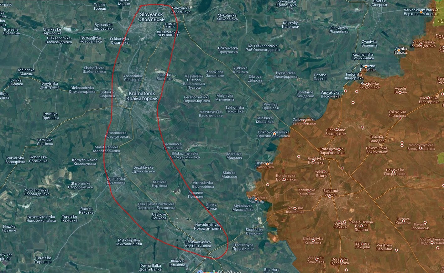 This crucial Slovyansk is the northern end of the Sloviansk - Kramatorsk - Kostyantynivka line; the final major defense line of the Donbass. In the south, two major RU offensives are pressing the line's demise.