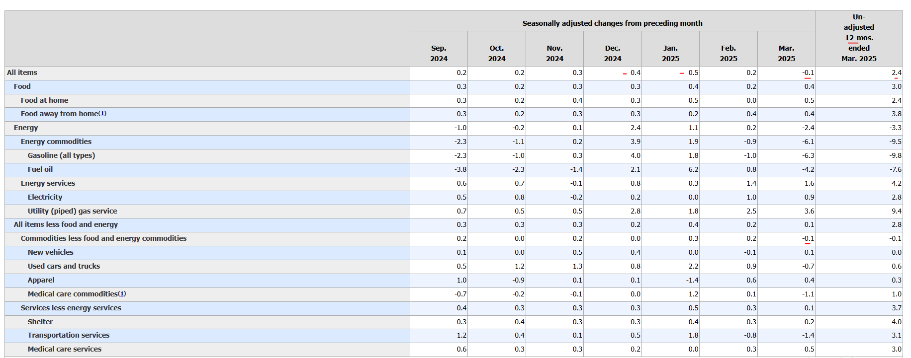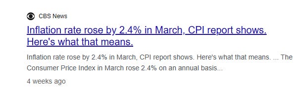 The media reported inflation at 2.4% in March, weather some reported it as “rose” like CBS or slightly “cooled” as some others. The truth is the report for March is of course, for March, and it was -0.1%. Negative inflation.