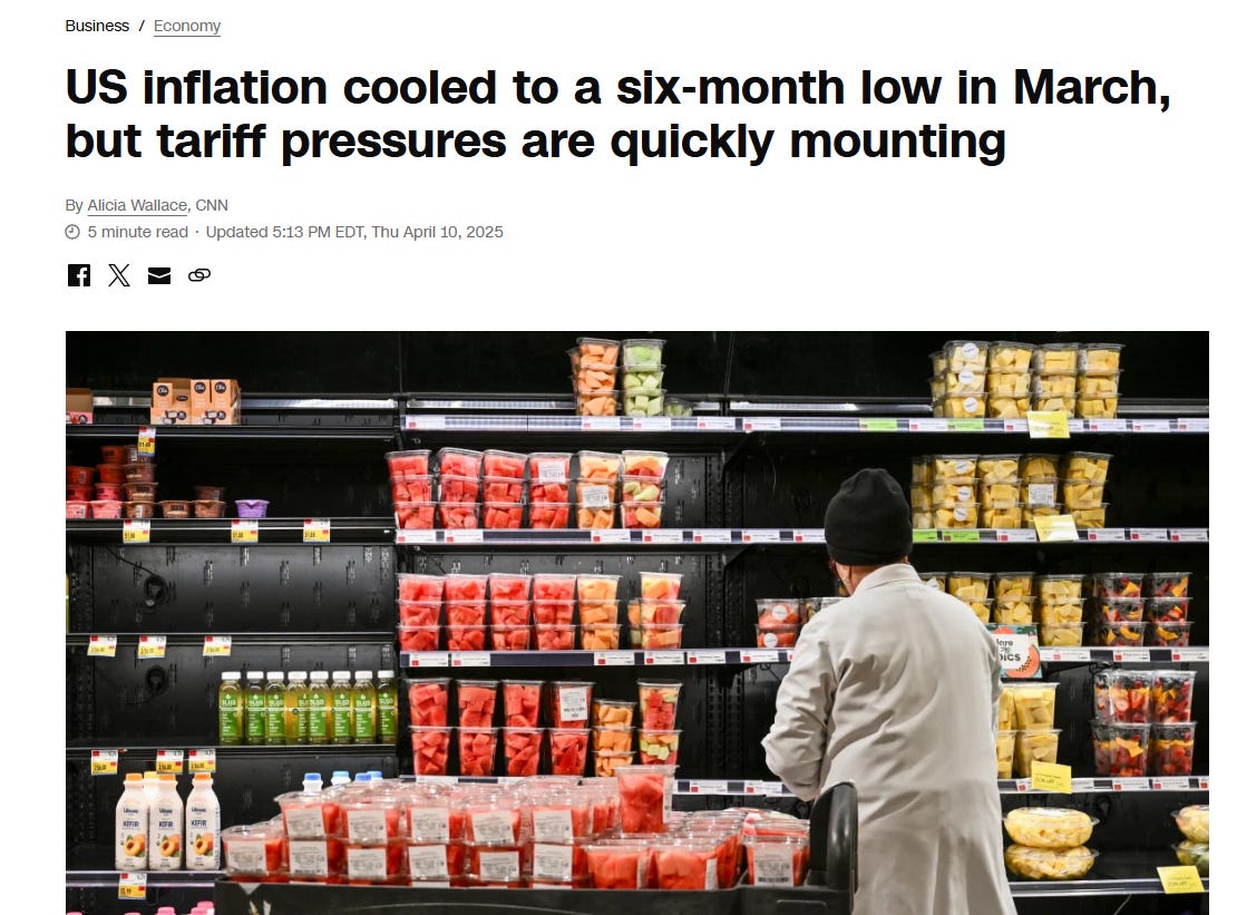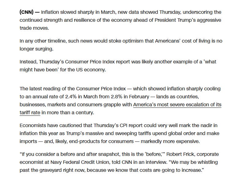 Looking at our friends over at CNN for some misinformation, note that the headline does indicate inflation “cooling” in March (though in fact it was a negative inflation, so not cooled but non-existent and in fact reversed), but quickly warns us of the doom to come by (Trump) tariffs.
