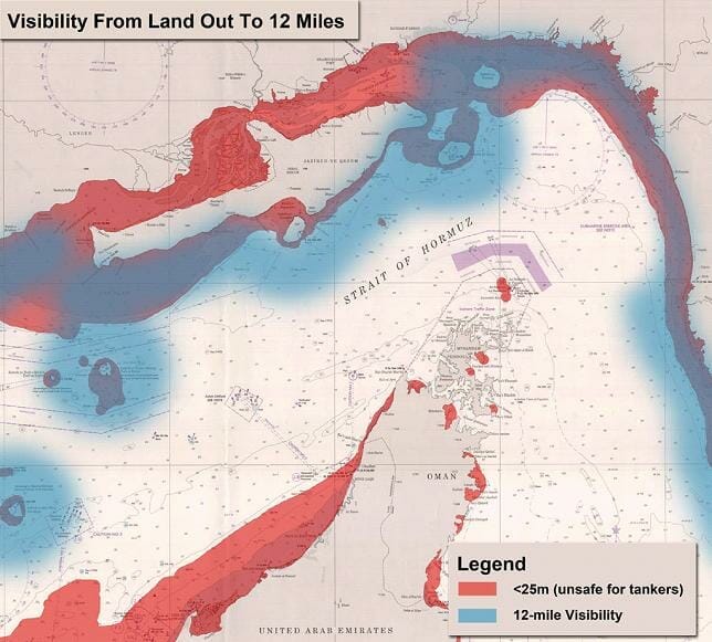 we see that Qeshm island, and other Strait islands are of supreme importance in controlling the Strait. Only 100 feet height above sea level typically gives an observer a 12 mile visibility arc towards the horizon. Ships have to sail very close to that visibility window when it comes to Qeshm island.