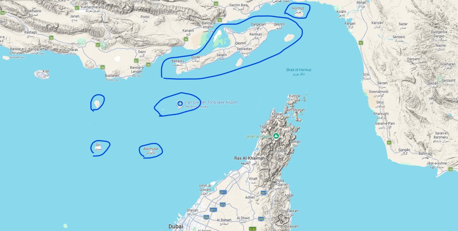 I will follow up later on with more details on these, but note that due to the shallow waters of the Gulf, large tankers need to sail between Greater Tunb Island and Abu Musa island.