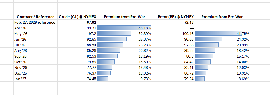 The oil futures, both West Texas Intermediate in the US and Brent Crude in Europe see a pretty dramatic drop in prices in the next few months. We see that by the beginning of 2027 (and the Nov election), prices for both are nearly back to the historically low price pre-conflict on Feb 27 2026 (only 8.7 - 9.7% higher).