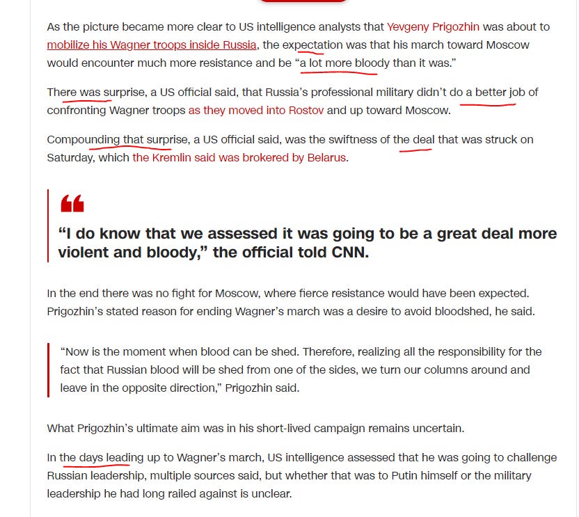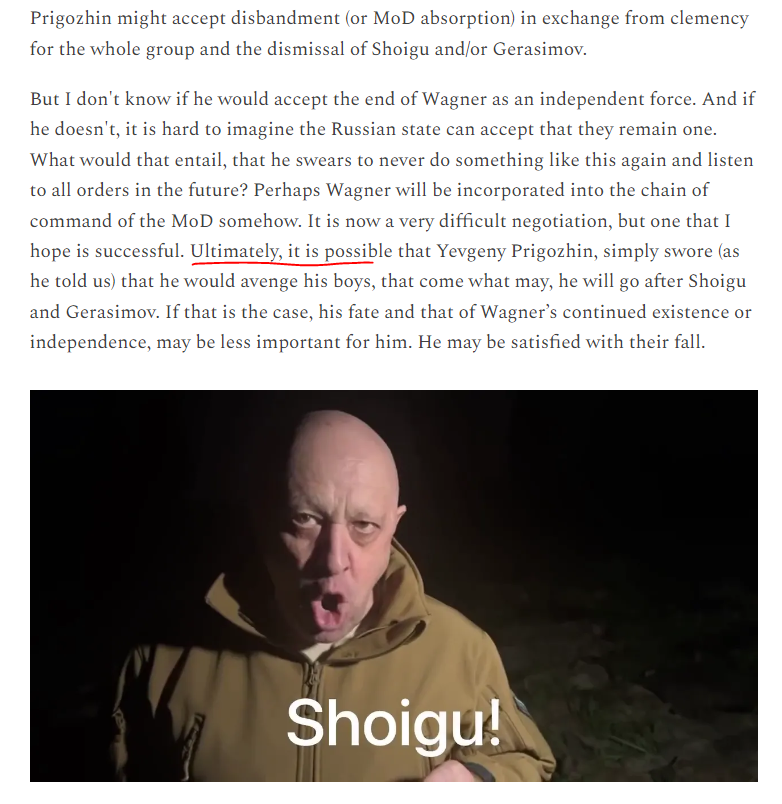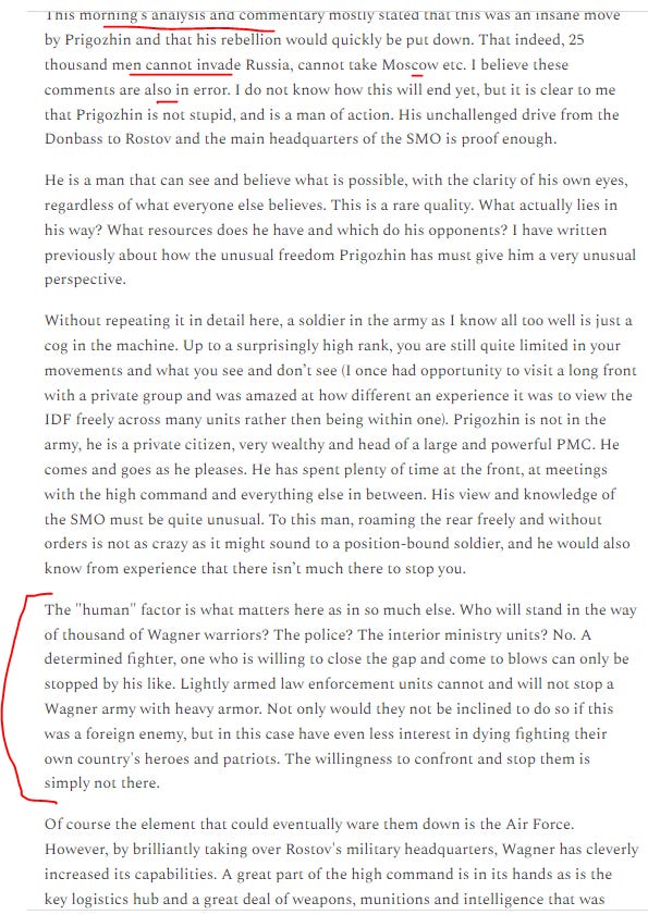 We see evidence of this in that it seems that I also was correct in speculating that Putin's speech in the morning was in (strategic) error (though well delivered, reasonable, and stabilizing if not inspiring) and Prigozhin's concerns were not addressed for months.