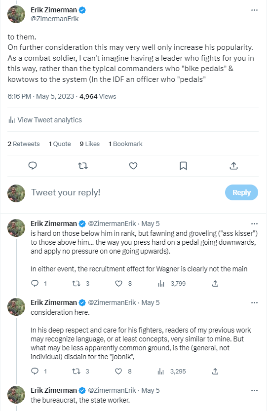 These statements further make me believe that not much of this is staged… at least not in agreement between Prigozhin and the Russian government. He just likes to tell it like it is, and does not like to see incompetence among big shots cause the death of his people. He also doesn’t like the death, which he sees up front and personal, of his brave Russians and the Ukrainian brave “Russians”. Really, all comments that you could have picked out of my posts since the first days of the war (perhaps mine a bit more diplomatic, a bit less populist, with less cursing and less internal petty politics), and not at all the talking points seen and believed in the mainstream western press. They align in minimum areas by coincidence if ever, it doesn’t bother Prigozhin he isn’t big on talking points.