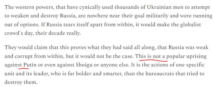 While I think there is a chance Putin & Prigozhin are more in cahoots then it may appear (as we have discussed previously and will later in this piece), I do not think it likely at all that he is in the West's pocket1. He could be in contact with them, for his own purposes, but not their tool. The most probable take is that things are simply as they appear.