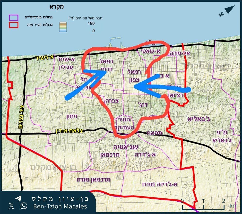 These overstate IDF presence because they are based on evacuation orders (ie where the IDF planned it may go or was ordered to go) for civilians and not actual army presence, but it gives you a rough idea. An Israeli blogger even posted the following, showing how little of Gaza City was left to take.