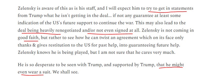 Additionally, I criticized Zelensky for (knowingly) going to sign a deal that was obviously a detriment to Ukraine in exchange for nothing really (though it wasn’t much good for the US either ironically), in order to sit in front of the cameras with the new POTUS.